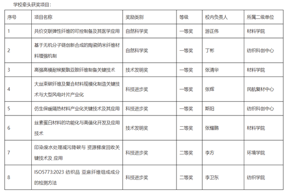 据悉,2025年度中国纺联科技奖项中,我校牵头或主要参与获奖科技成果共计21项(人),其中以第一完成单位获自然科学奖一等奖2项、技术发明奖一等奖1项、科技进步奖一等奖2项。